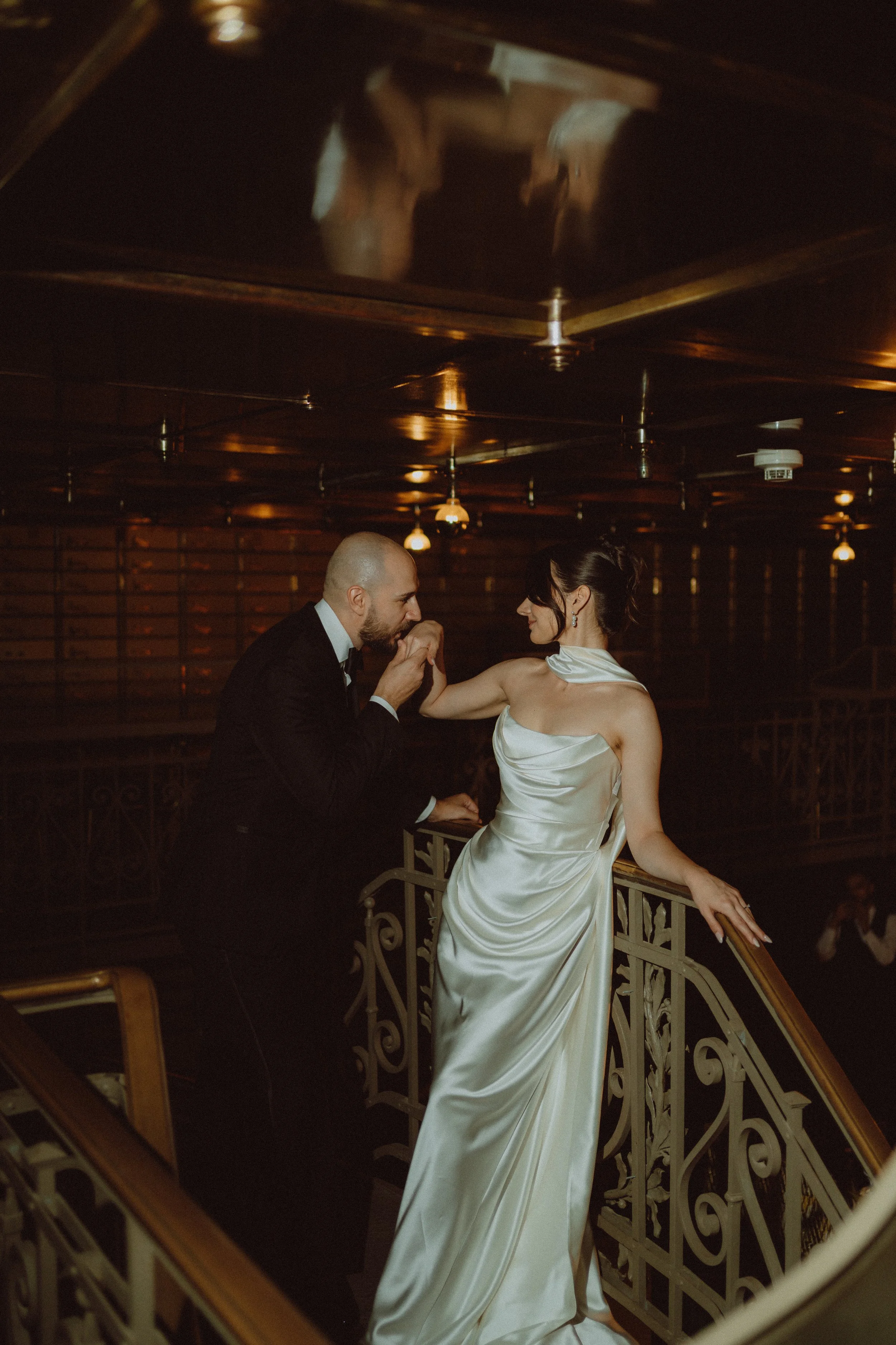 They got ready in The Vault, the old bank vault turned bar, where the steel doors, geometric patterns and warm light made everything look like a perfect intersection between their world and ours. We tried to mirror those architectural elements throughout the gallery, using symmetry, reflections and textures as small nods to who they are beyond this one day.